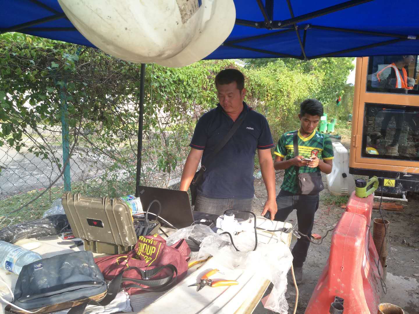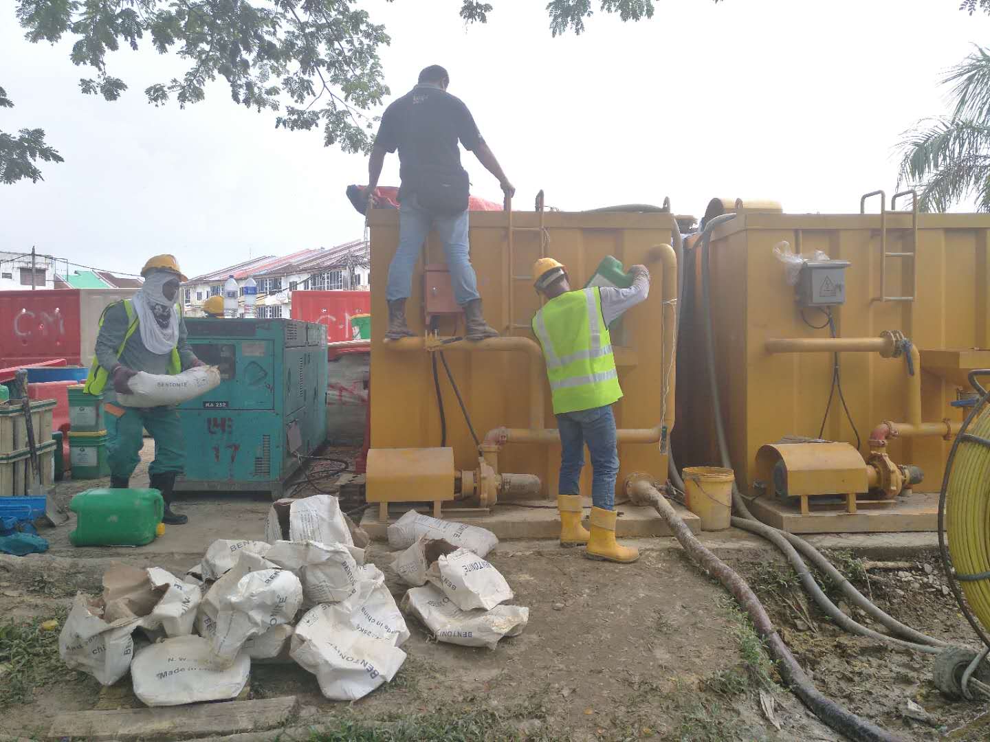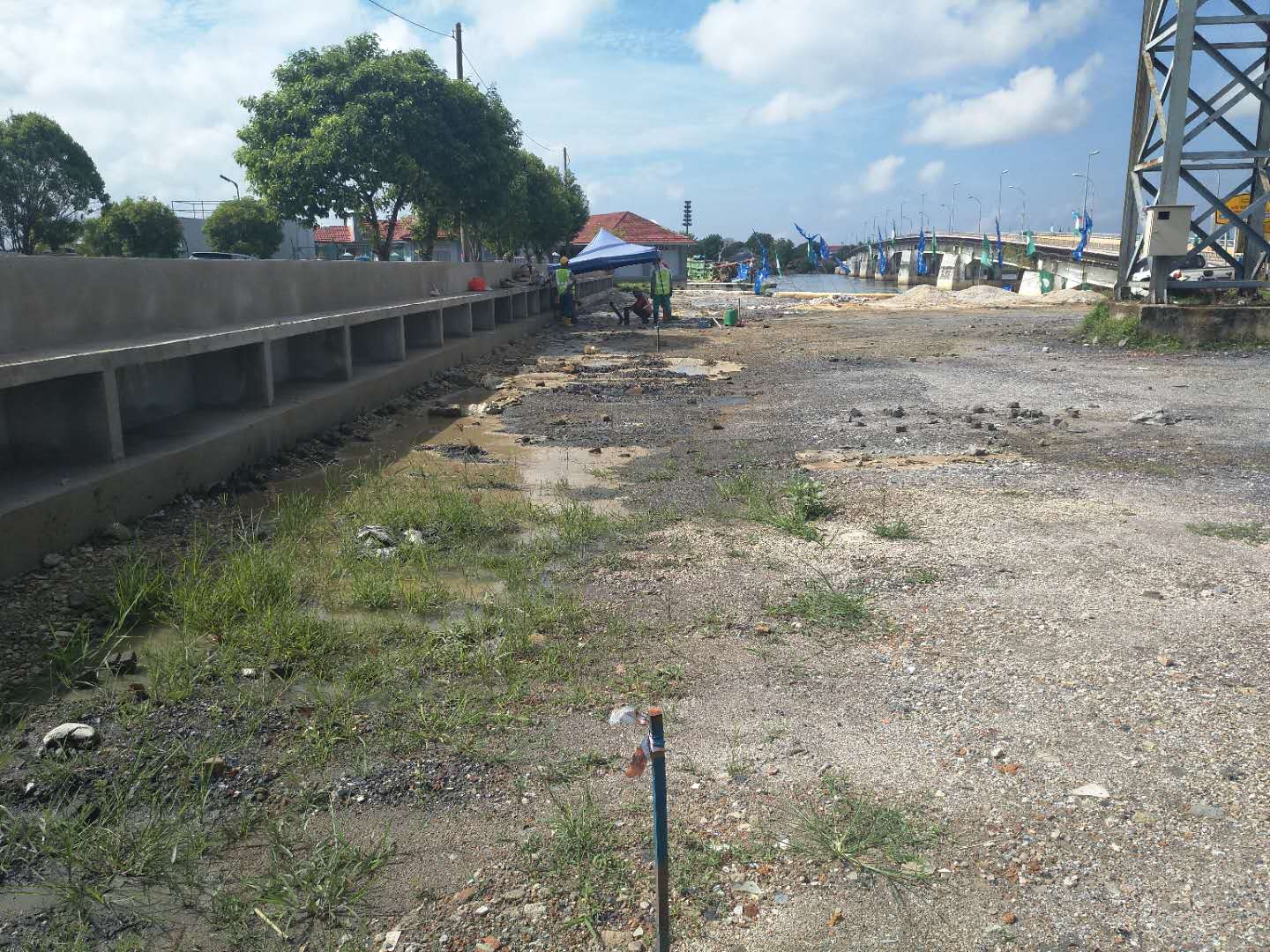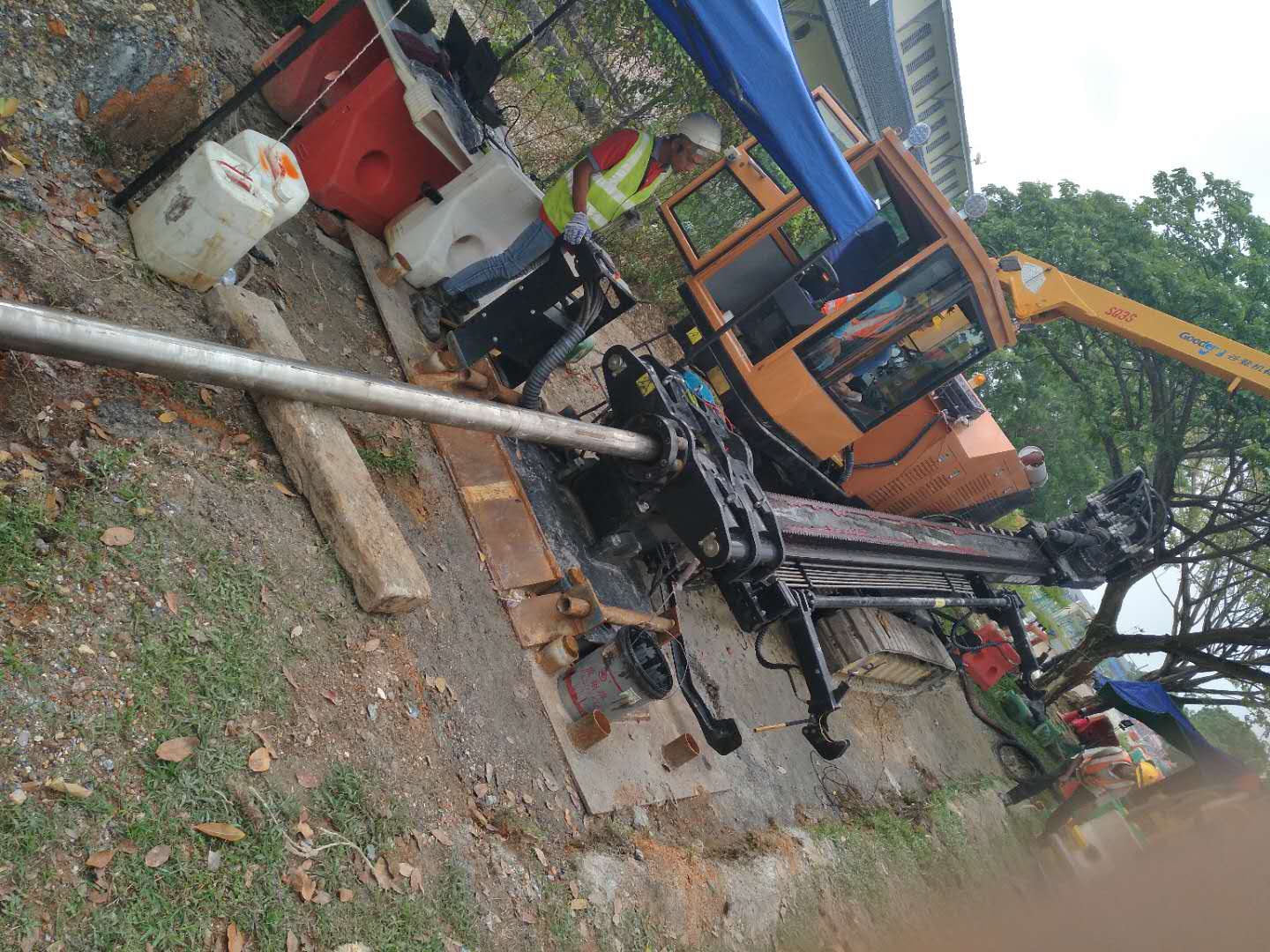 這次穿越鉆機(jī)受限制,只能固定在一個(gè)地方,旁邊是給船加油的油廠,穿越差不多平行橋走,距離橋10米距離,處鉆口也很受限制,出鉆口有停車(chē)場(chǎng),有人工管網(wǎng)。